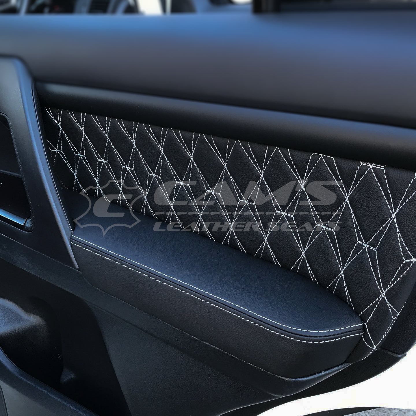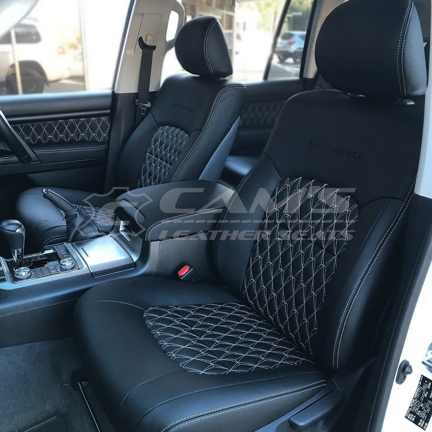200 SERIES LANDCRUISER - FULL ITALIAN LEATHER IN BLACK WITH X DIAMOND PATTERN IN SILVER AND DOORS AND CONSOLE TO MATCH