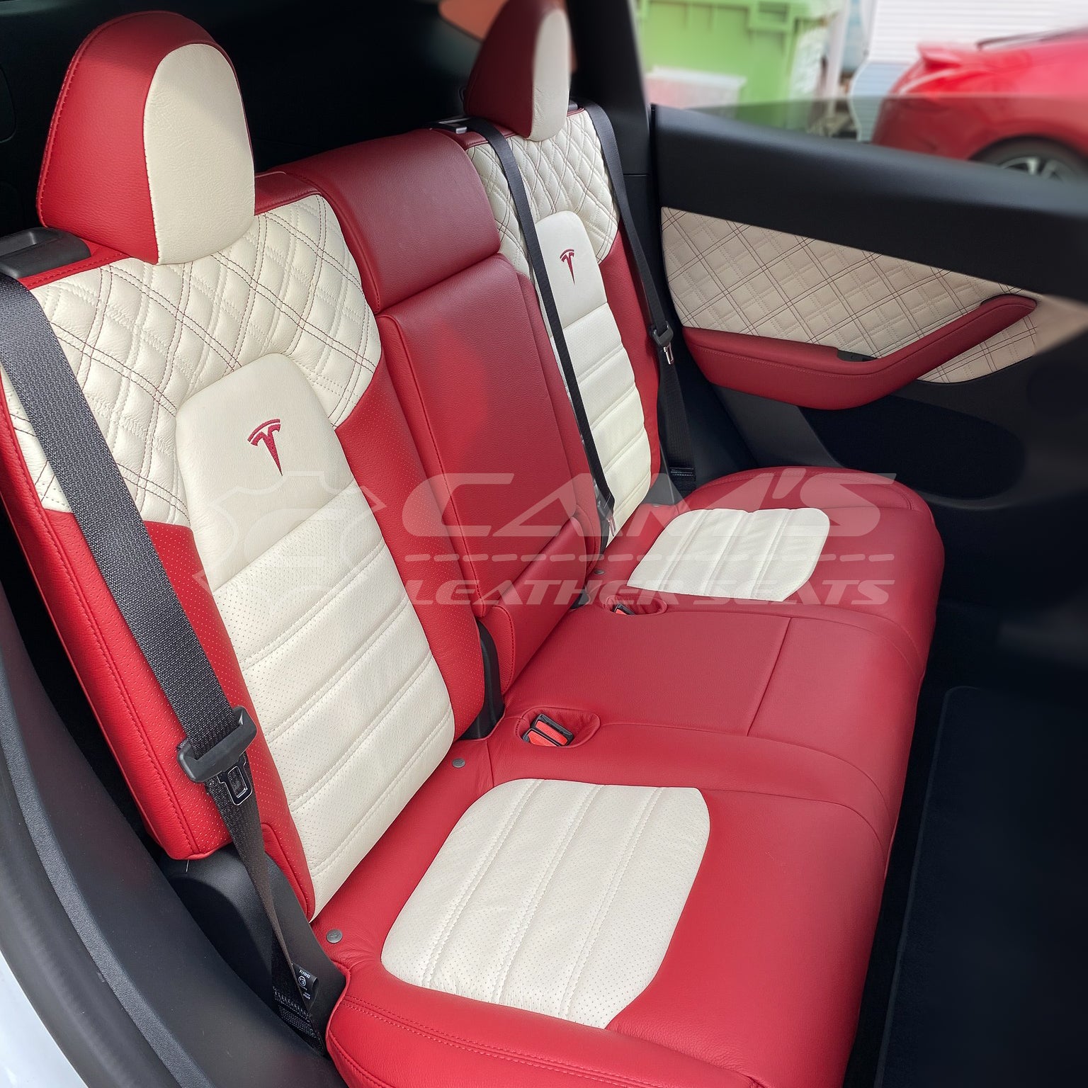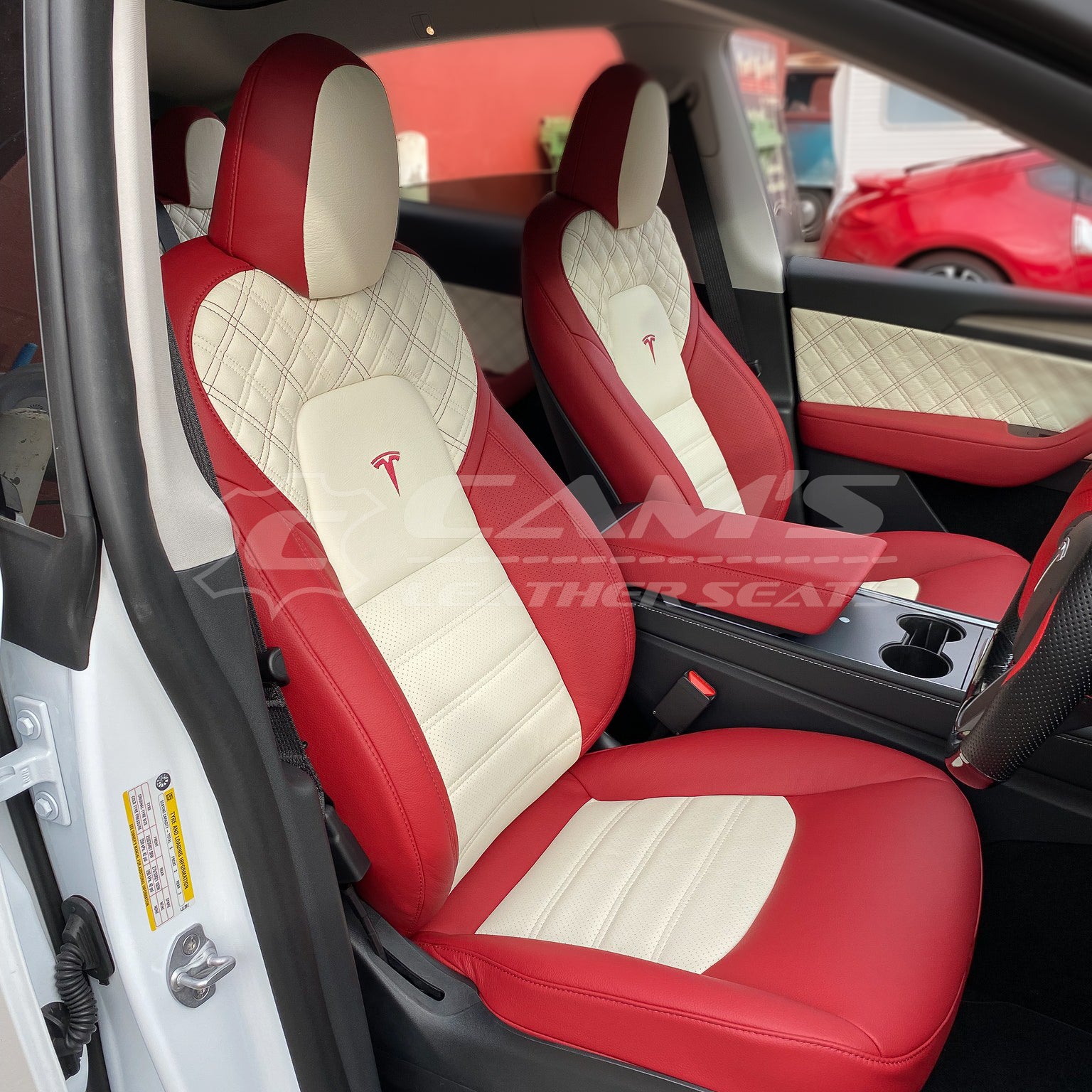 TESLA MODEL Y - CREAM & RED CROSS STITCH PATTERN WITH CONTRAST STITCHING & LOGOS