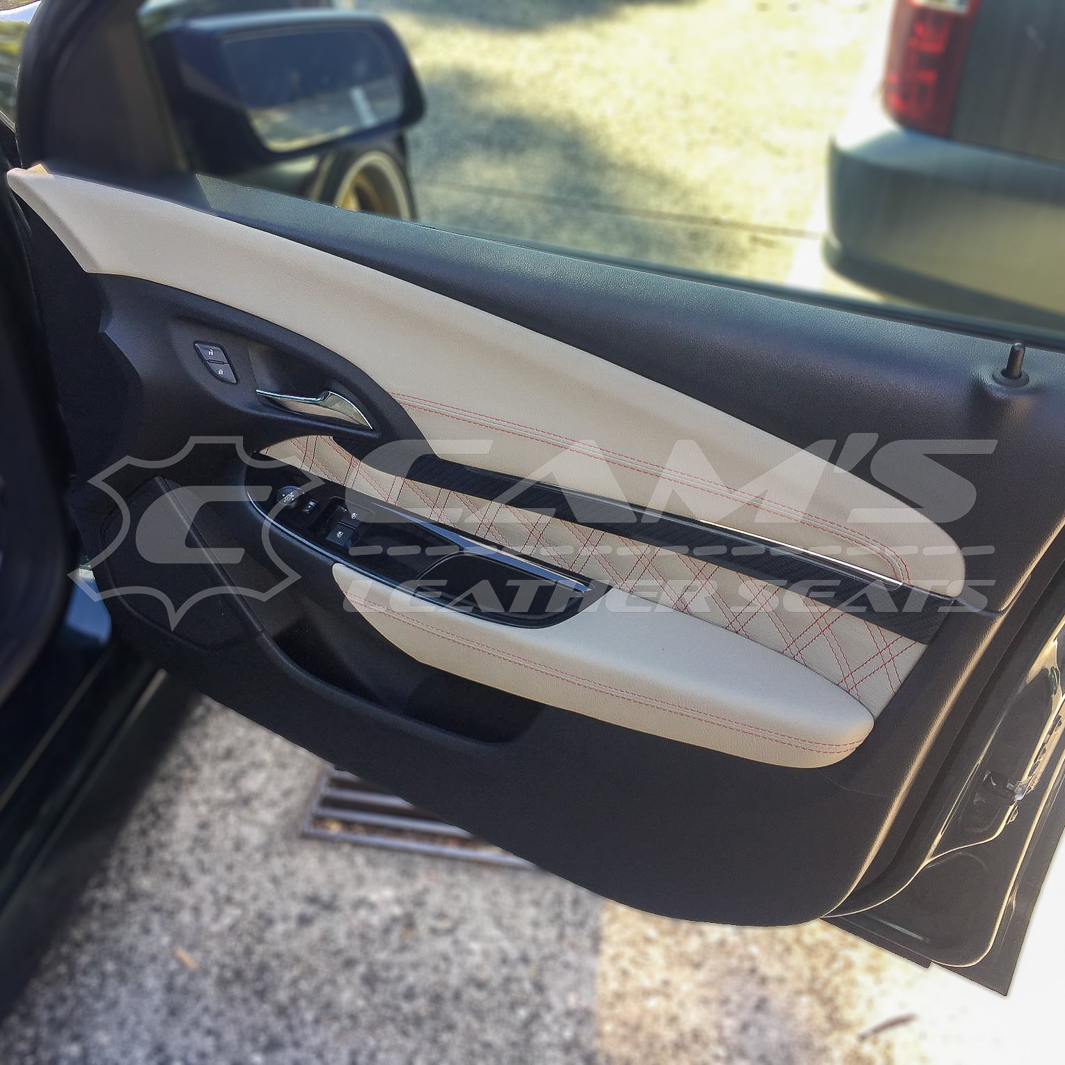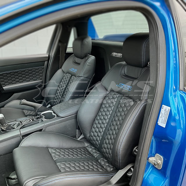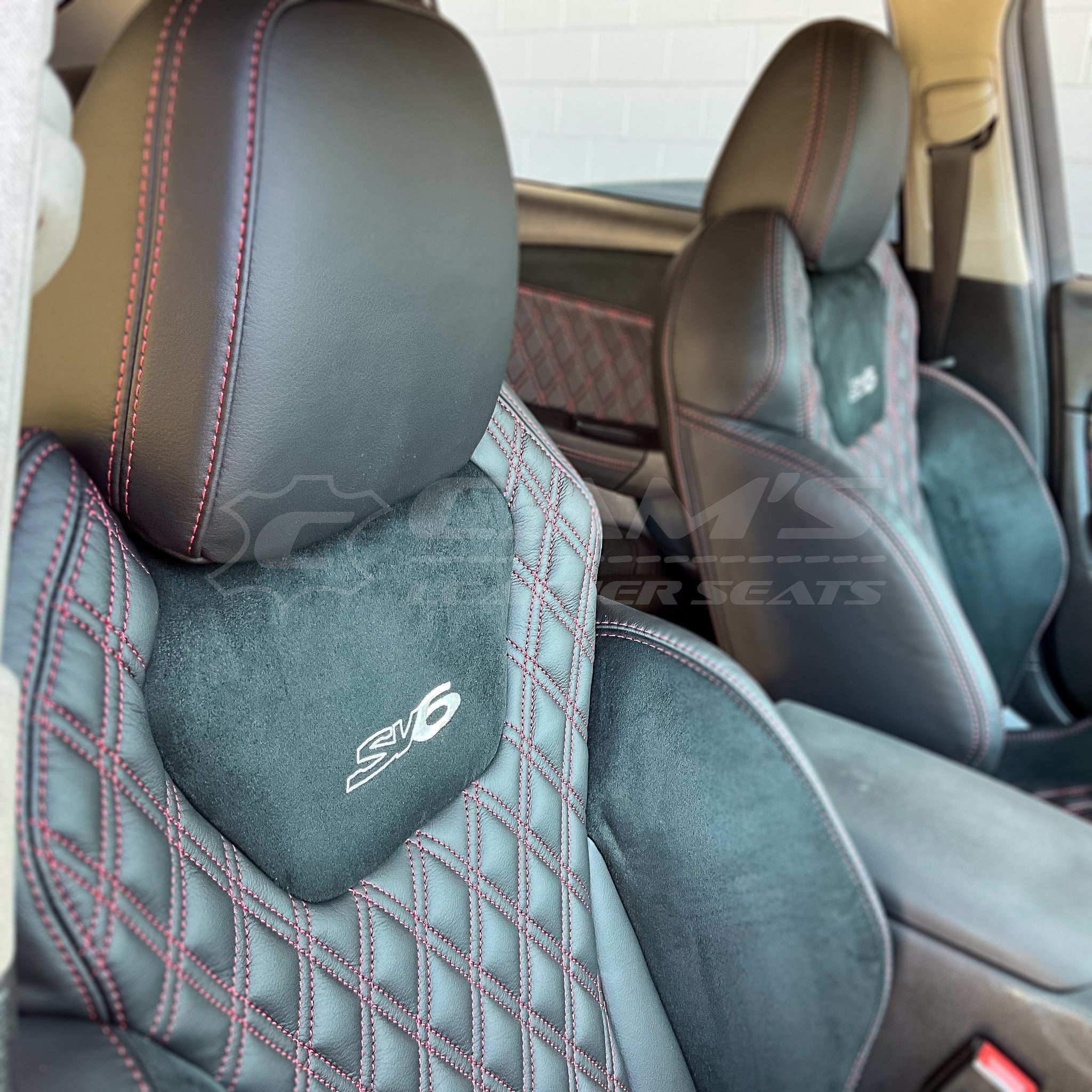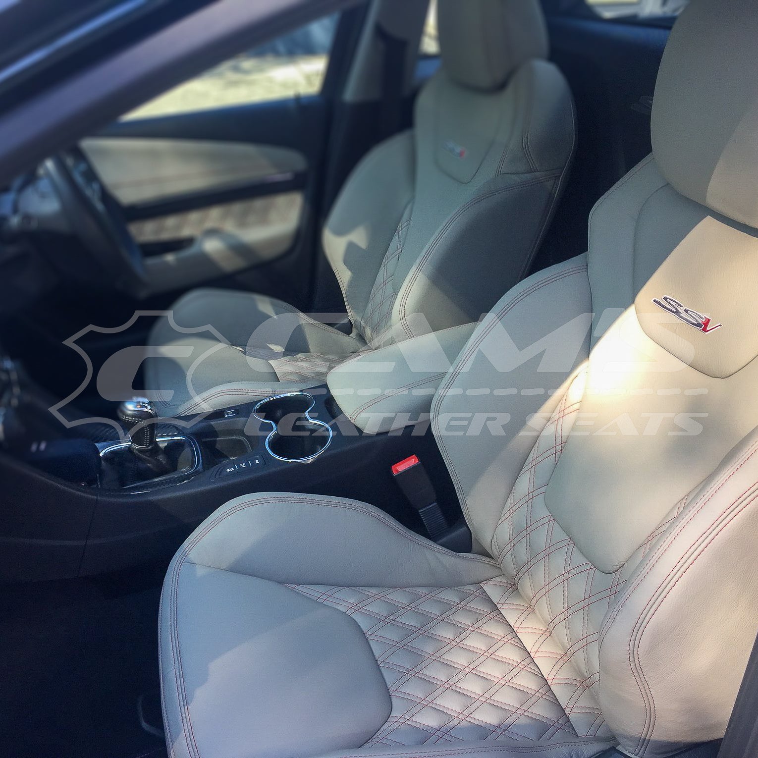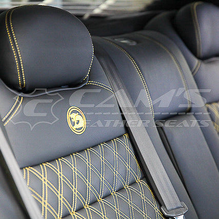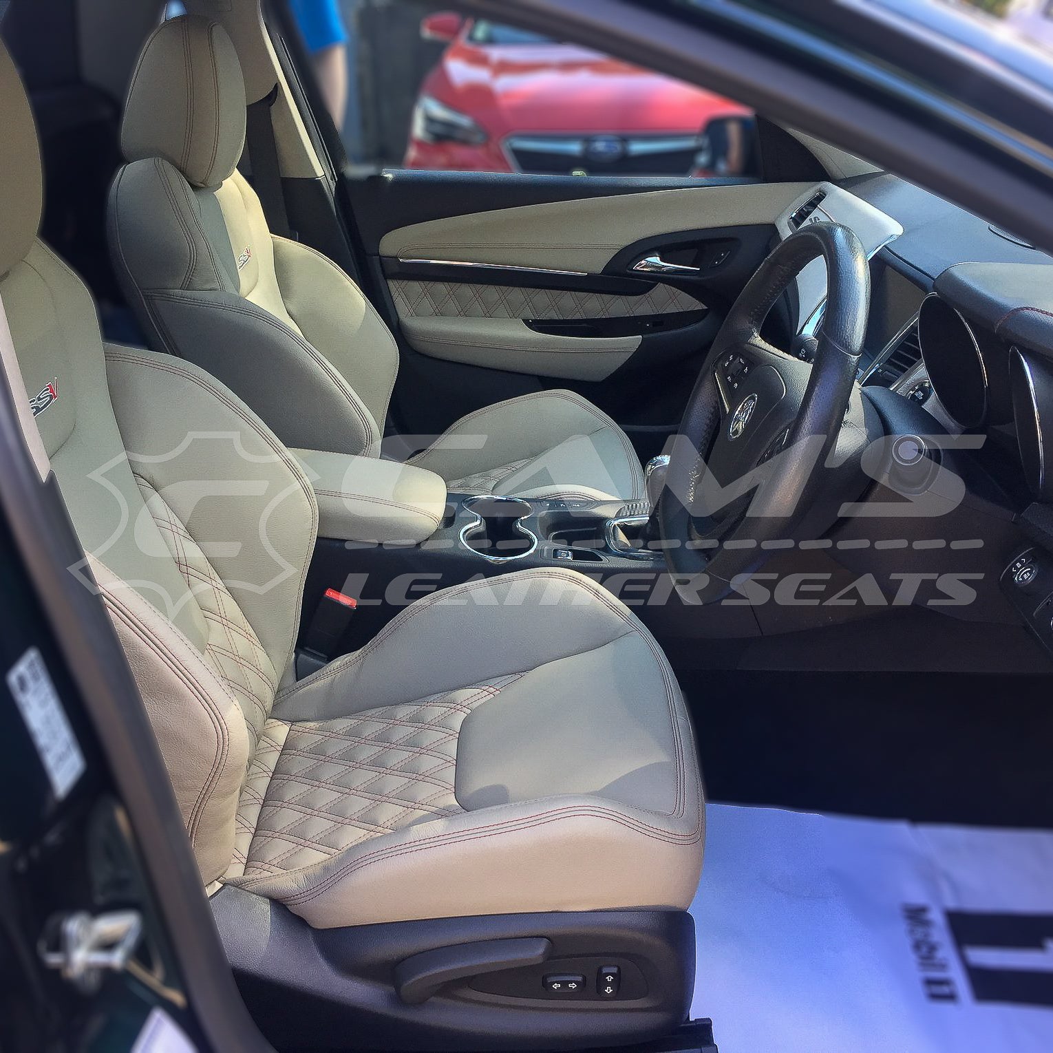 HOLDEN VF SSV UTE - GTS FOAMS UPGRADE, CREAM LEATHER WITH RED CONTRAST STITCH AND TWIN DIAMOND STITCHING