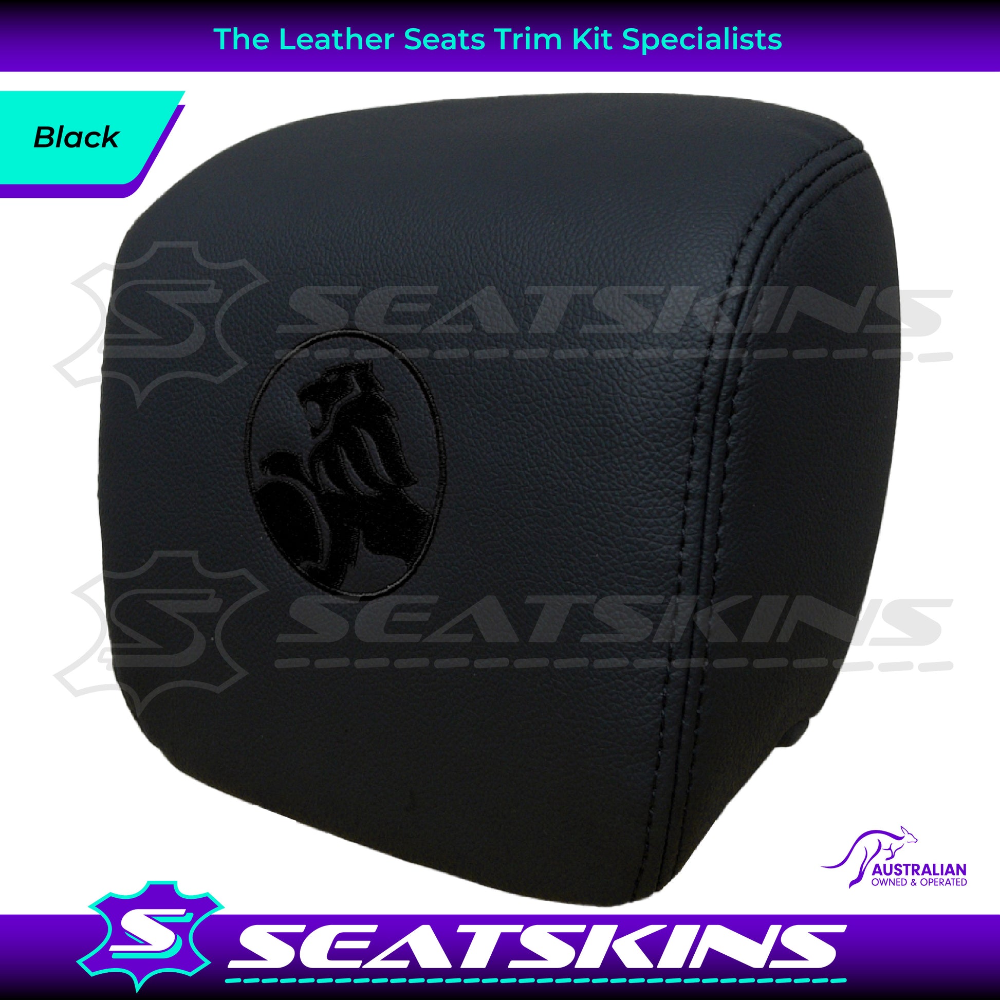 HEADREST COVERS PAIR FOR VE SEATS IN ONYX BLACK LEATHERETTE WITH BLACK STITCHING AND CHOOSE YOUR COLOUR FOR THE HOLDEN LOGOS!