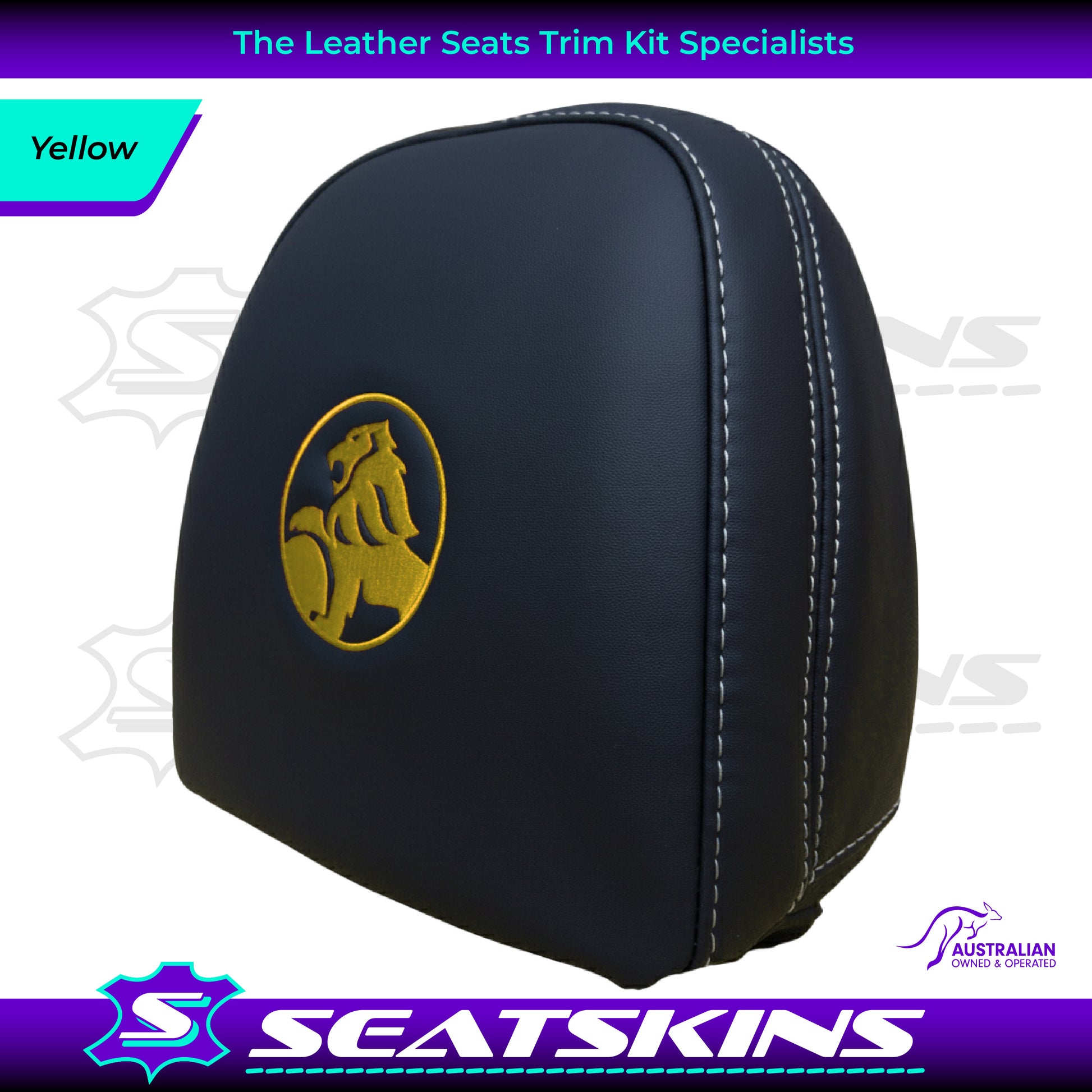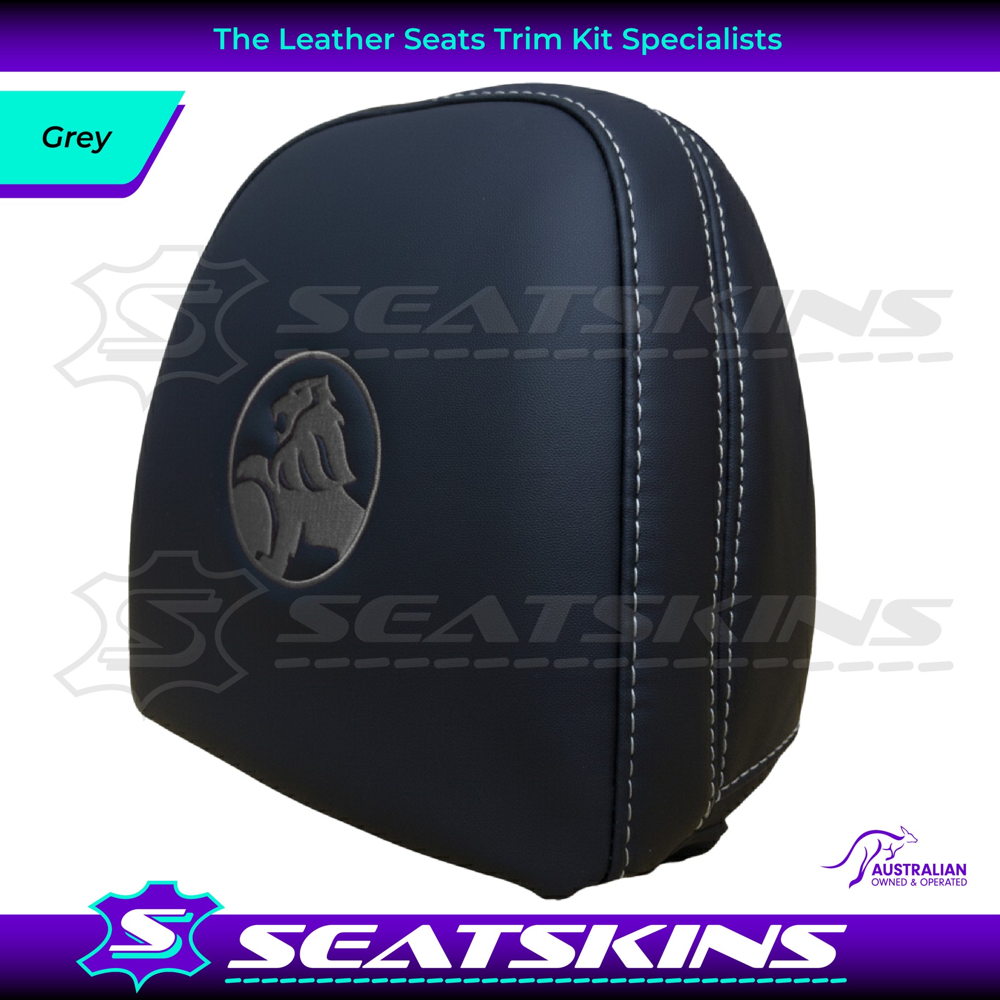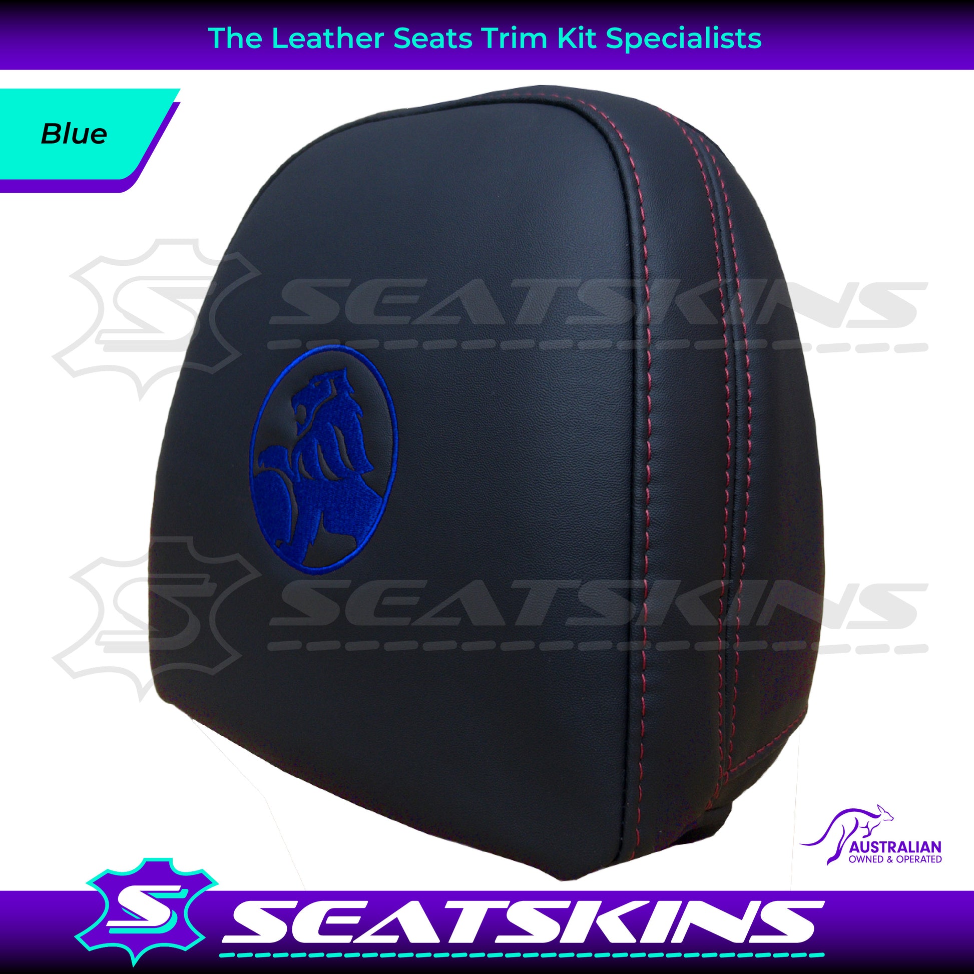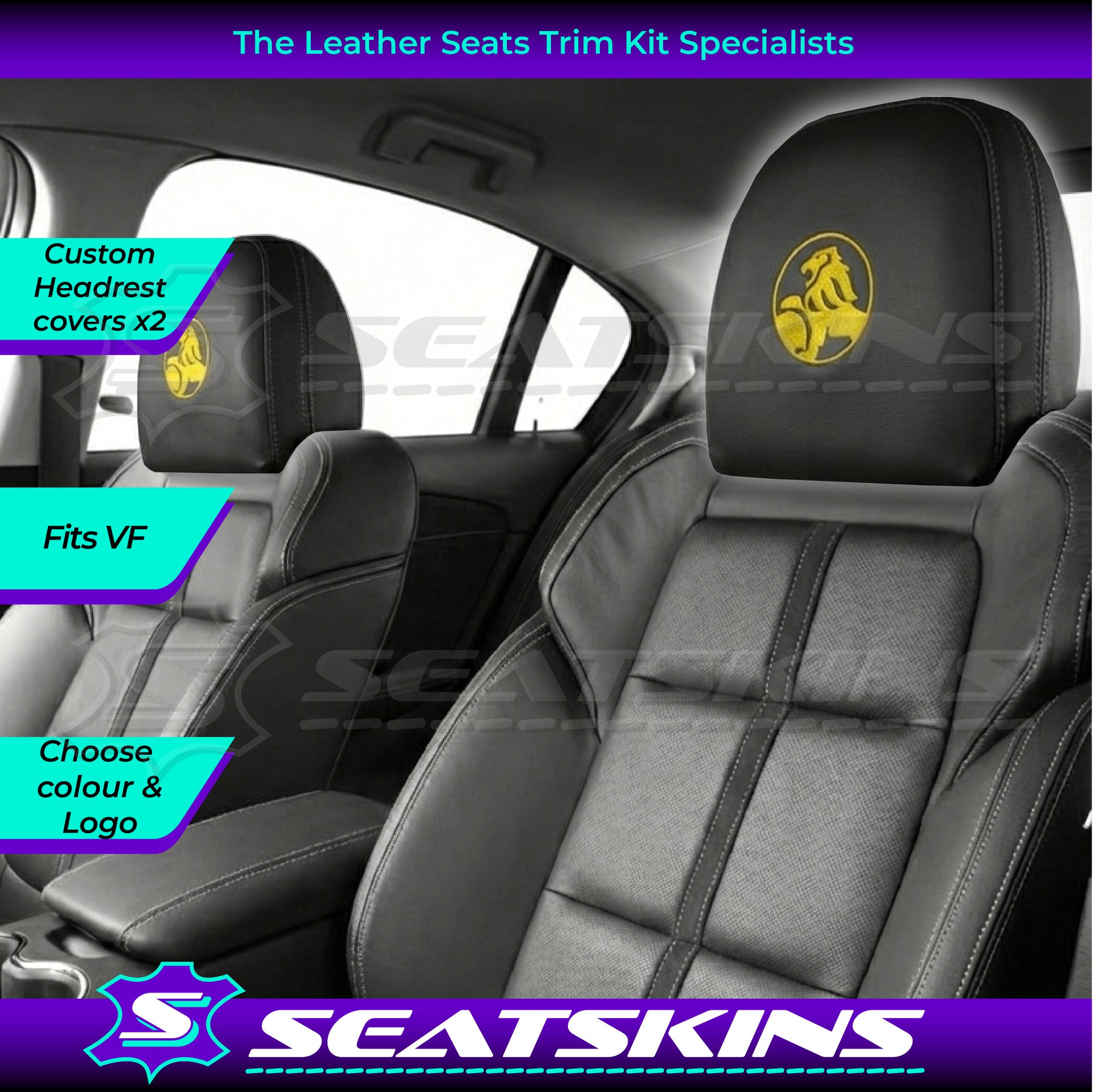 HEADREST COVERS PAIR FOR ALL VF SEATS IN BLACK NAPPA LEATHERETTE WITH SILVER OR RED SIDE STITCHING AND CHOOSE YOUR COLOUR FOR THE HOLDEN LOGOS!
