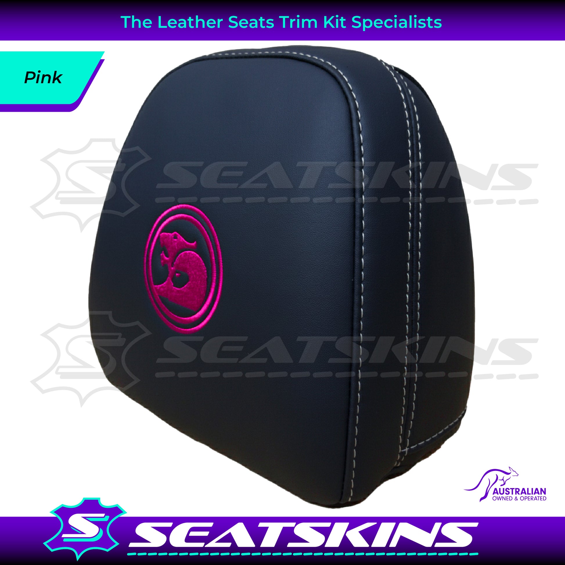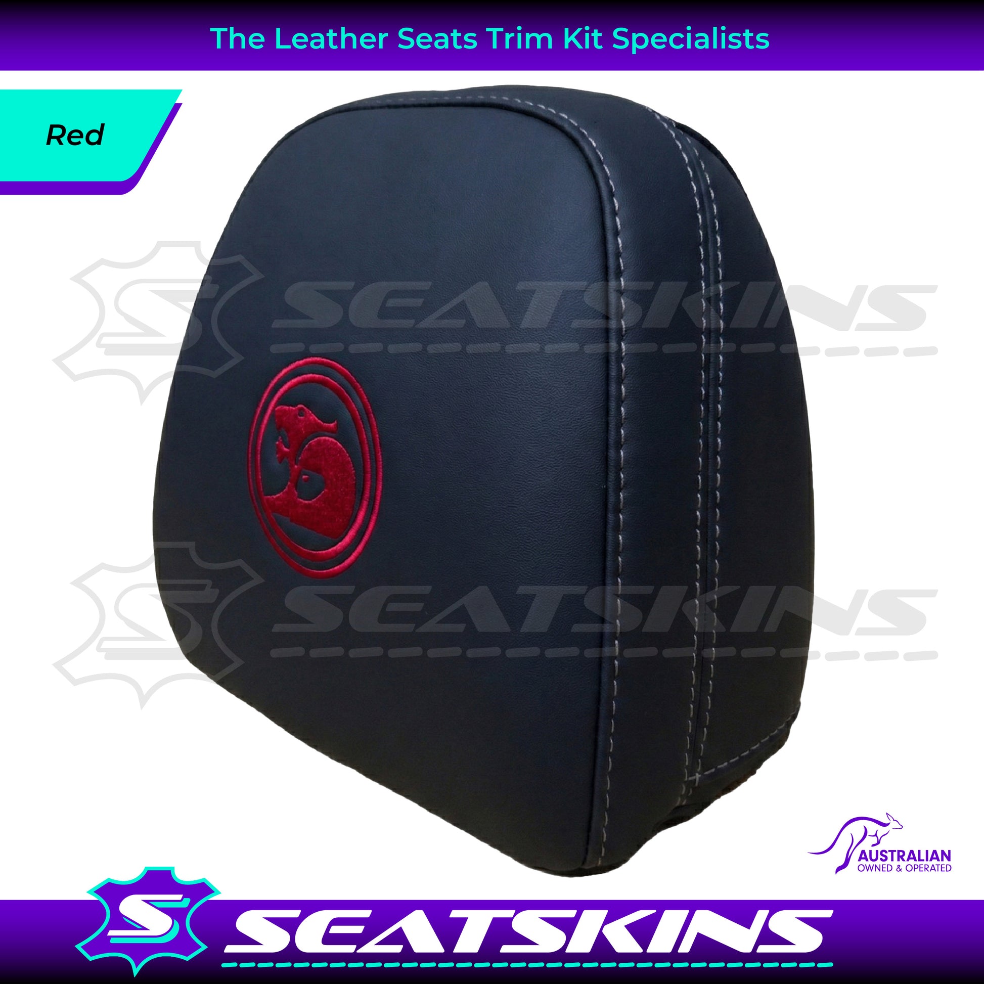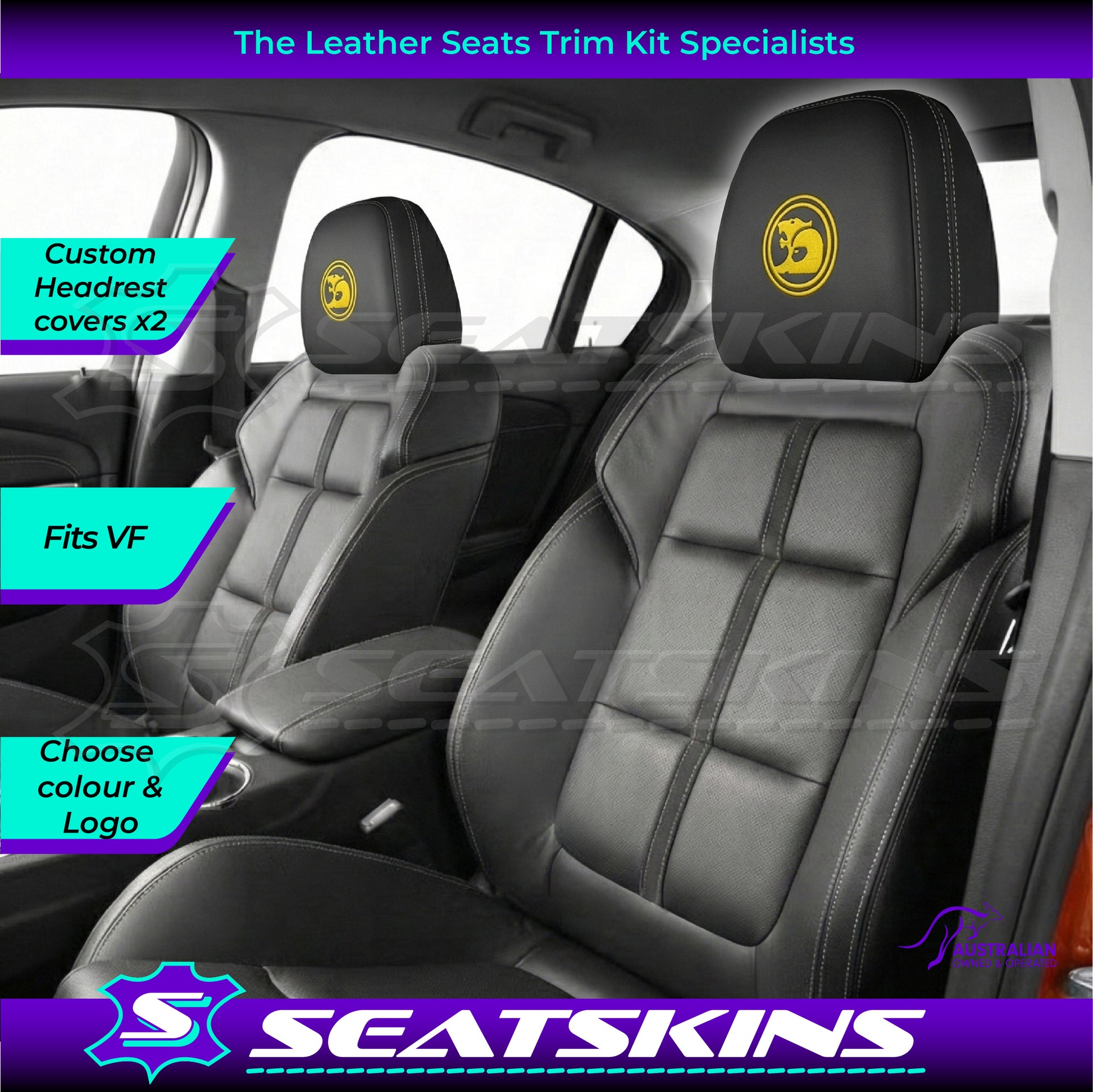 HEADREST COVERS PAIR FOR ALL VF SEATS IN BLACK NAPPA LEATHERETTE WITH SILVER OR RED SIDE STITCHING AND CHOOSE YOUR COLOUR FOR THE HSV LOGOS!