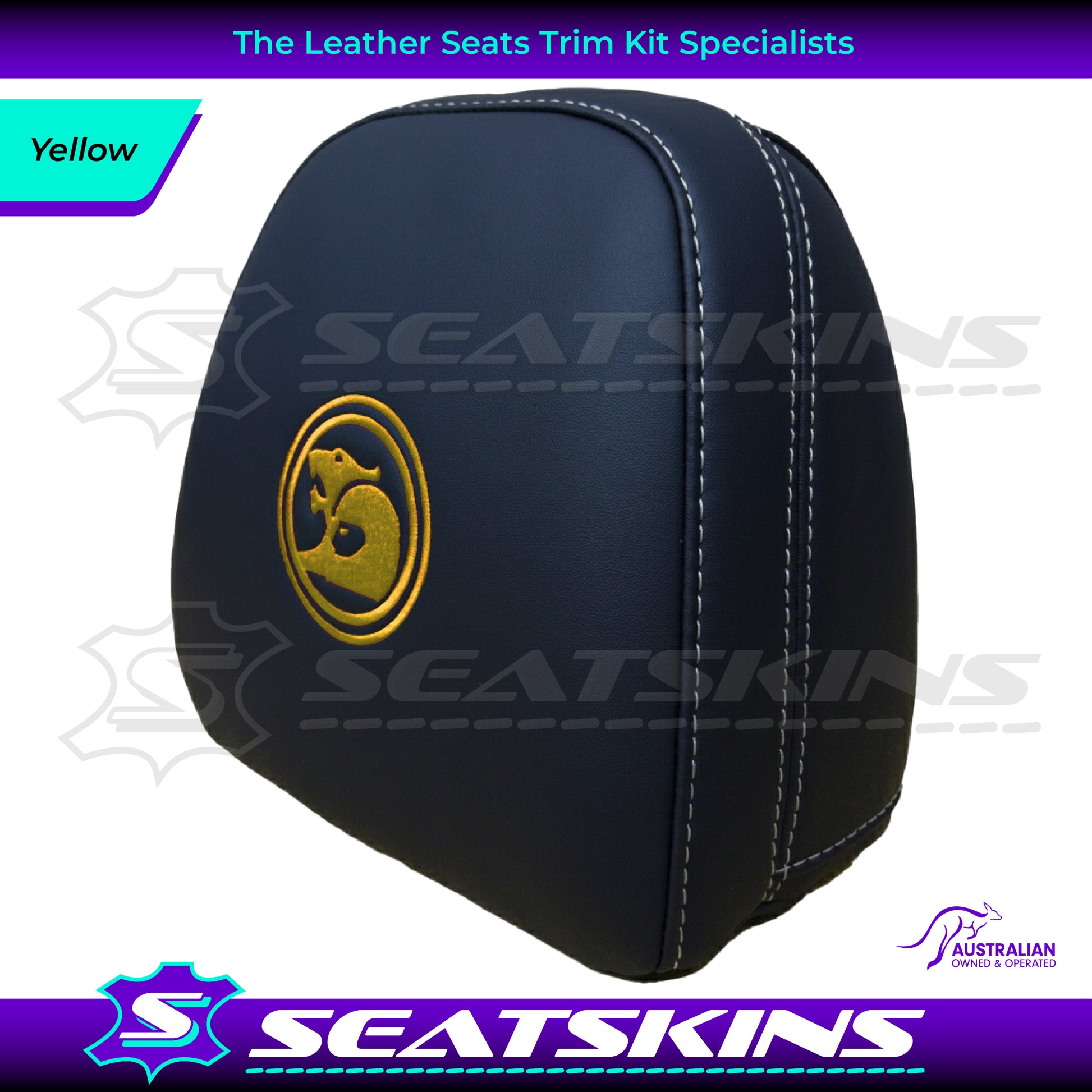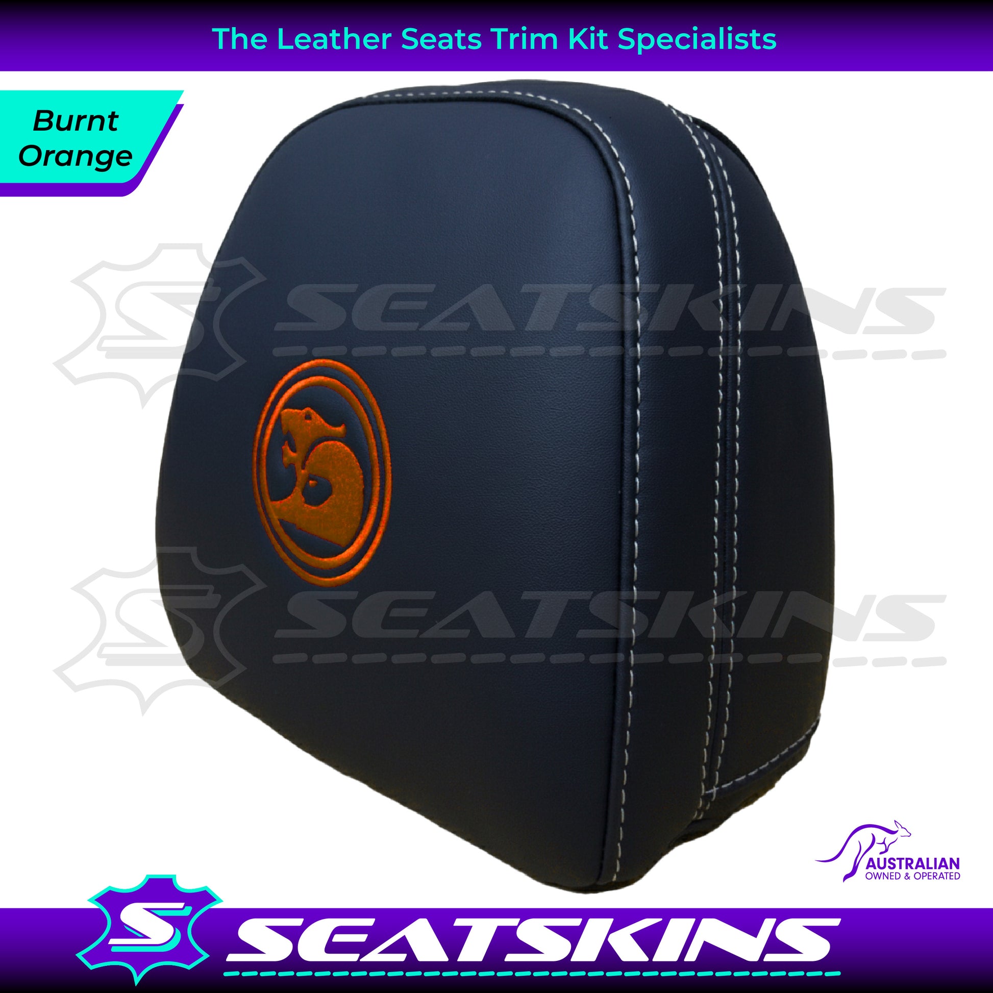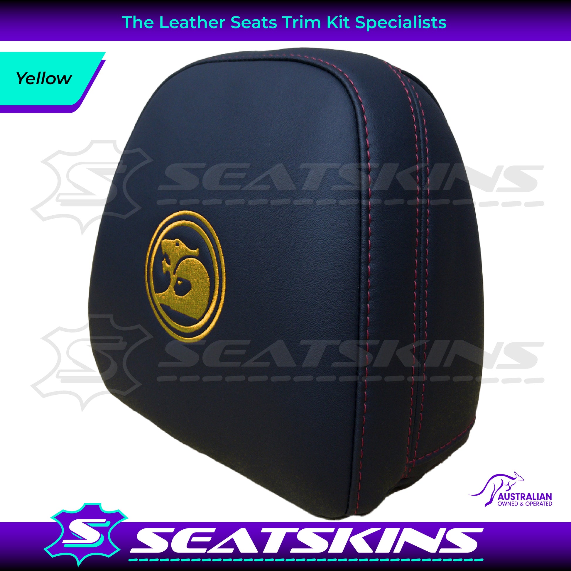 HEADREST COVERS PAIR FOR ALL VF SEATS IN BLACK NAPPA LEATHERETTE WITH SILVER OR RED SIDE STITCHING AND CHOOSE YOUR COLOUR FOR THE HSV LOGOS!