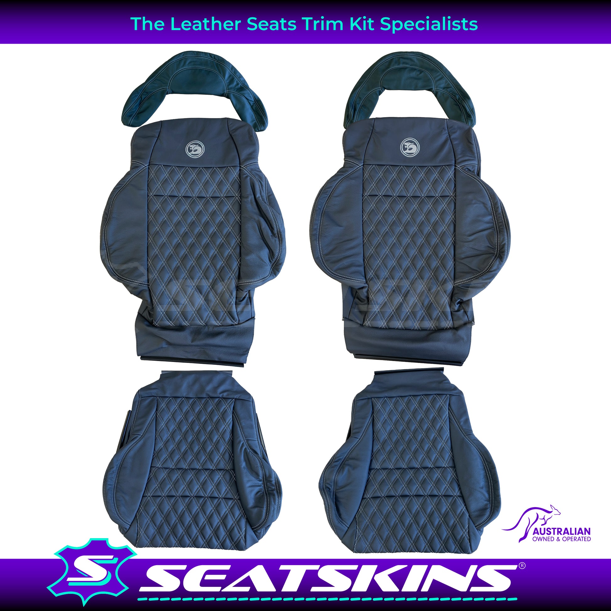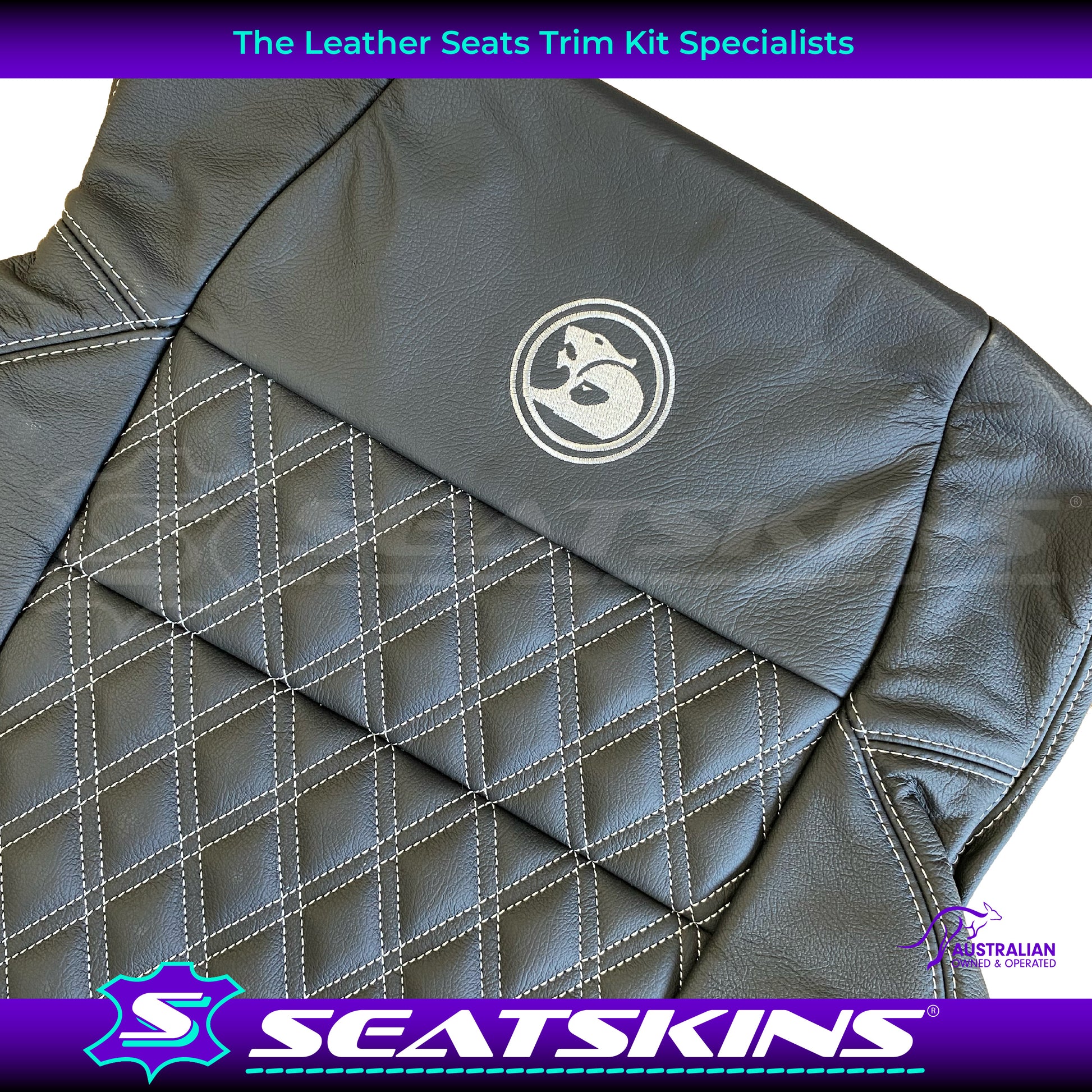 LEATHER SEATS TRIM KIT FOR HSV HOLDEN COULSON SEATS, UTE OR FRONT 2 SEATS IN ANTHRACITE BLACK WITH SILVER DOUBLE DIAMOND STITCHING AND LOGOS FOR FRONT SEATS (2 SEATS TOTAL).
