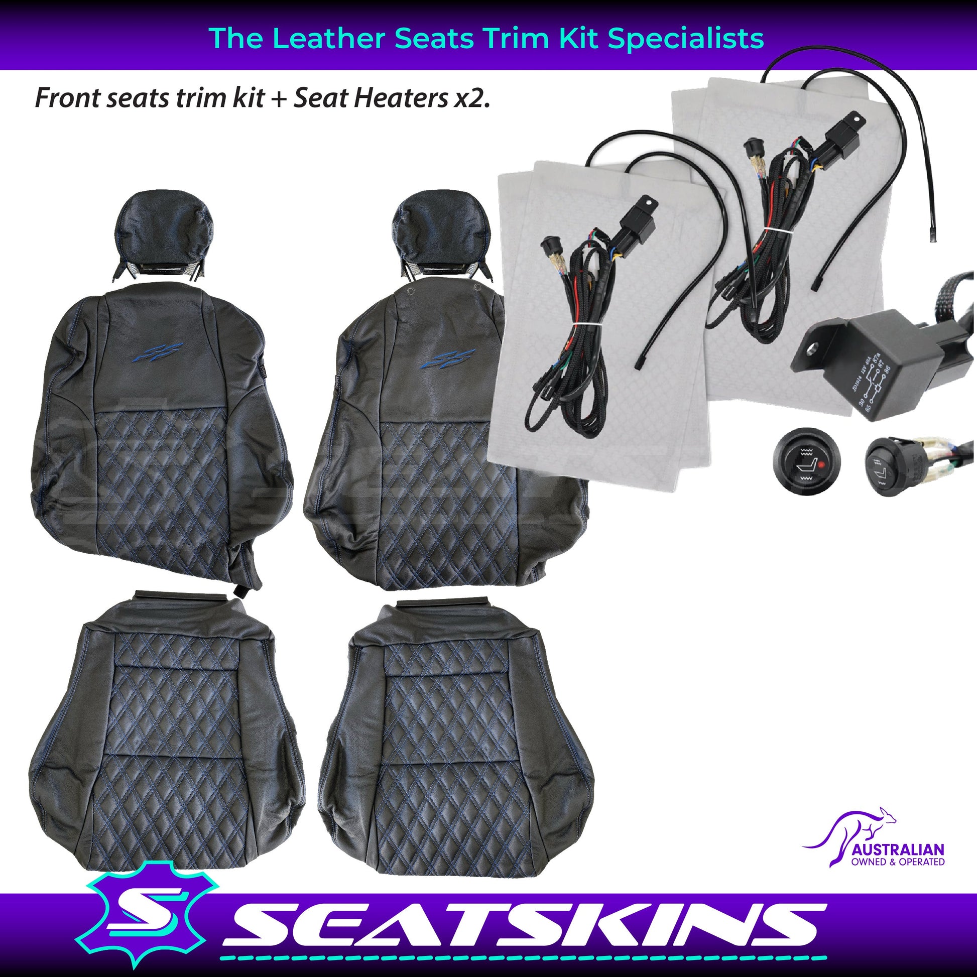 REPLACES THE EXISTING CLOTH TRIM ON THE 2 SEATS WITH BLACK ANTHRACITE LEATHER COVERS MADE TO OEM SPECS WITH BLUE DOUBLE DIAMOND STITCHED INSERTS & BLUE SS LOGOS.